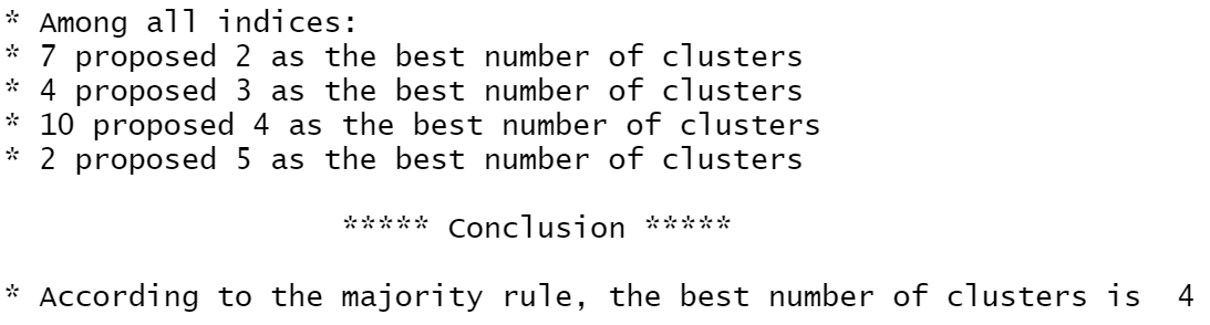 The R package NbClust compare lots of indices and conclude that 4 is the best number for clustering this dataset.